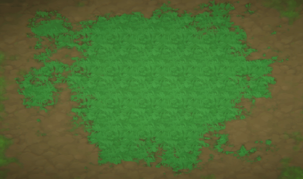 This shader effect was created to blend the desired texture with a separate alpha mask and some noise to convincingly have a terrain “grow” into place. This allows the user to easily place things like grass patches with customizable patchiness, while also allowing for code driven “reveal” effects when desired.