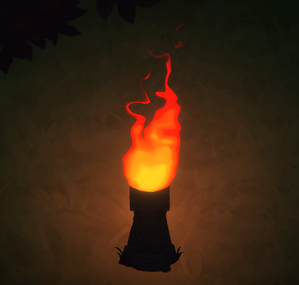 This flame effect is driven by a distortion shader which applies distortion based on the the y portion of the UVs. It also handles color intensity which allows the flame to glow.